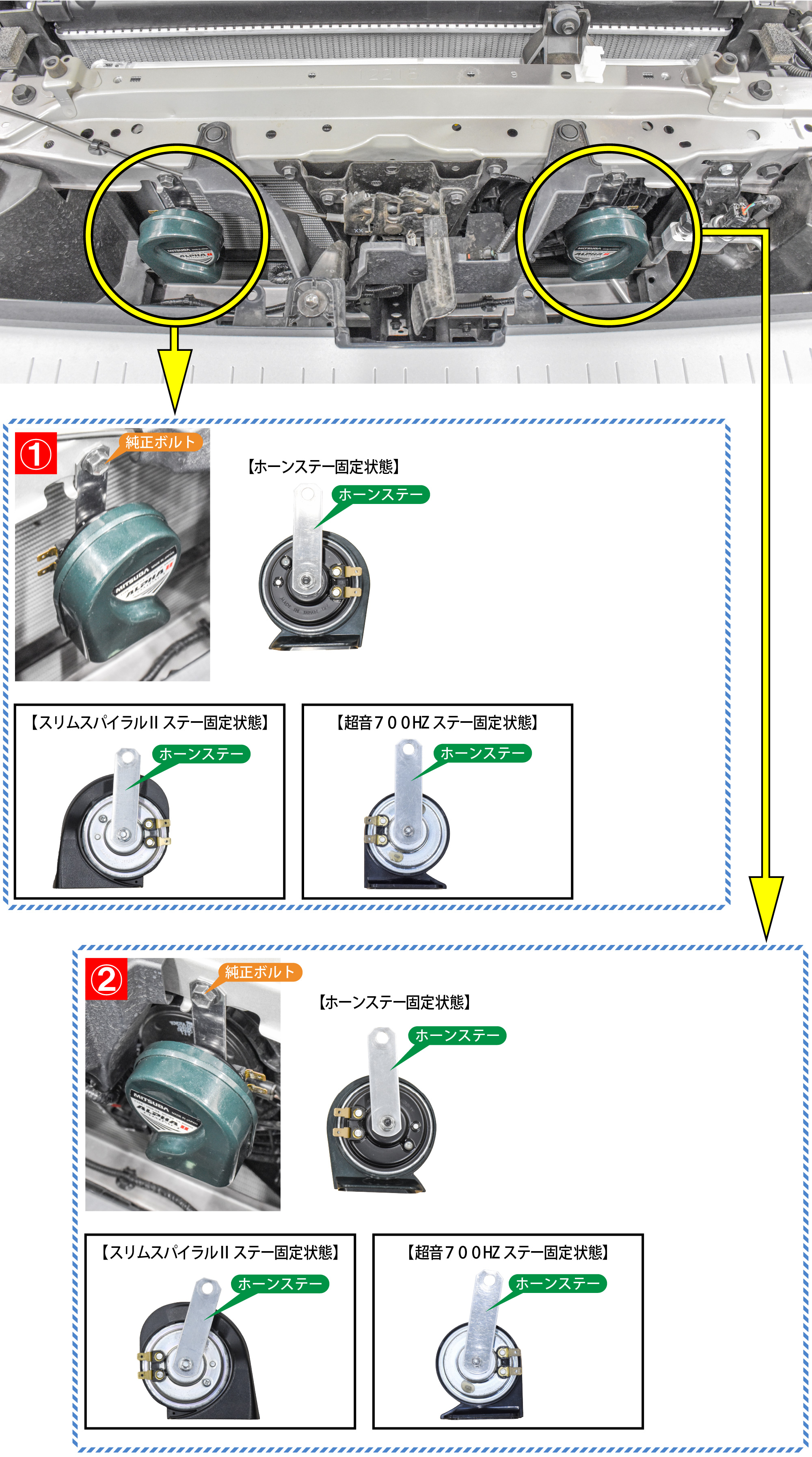 新設ホーンは、純正ホーン位置に各々取り付けます。