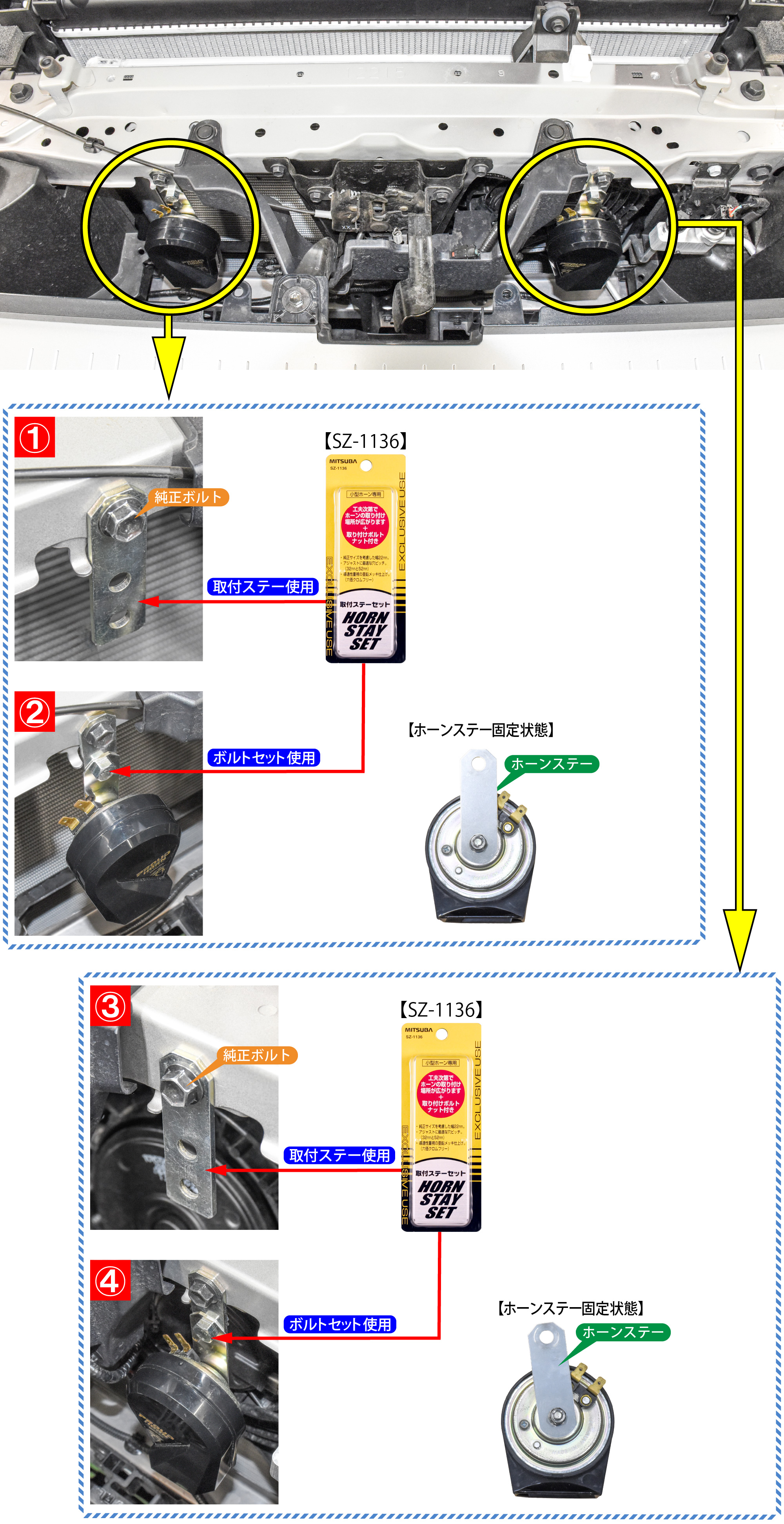①:純正HIホーンの位置に純正ホーンを固定していたボルトで取付ステー(SZ-1136)を画像のように固定します。